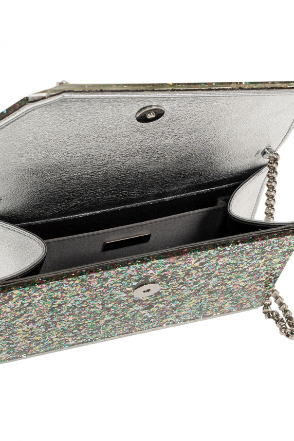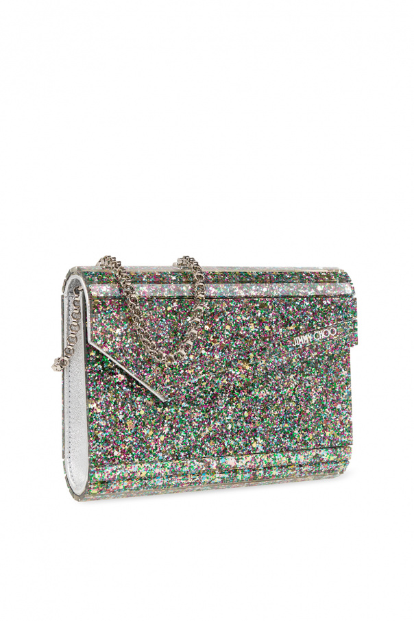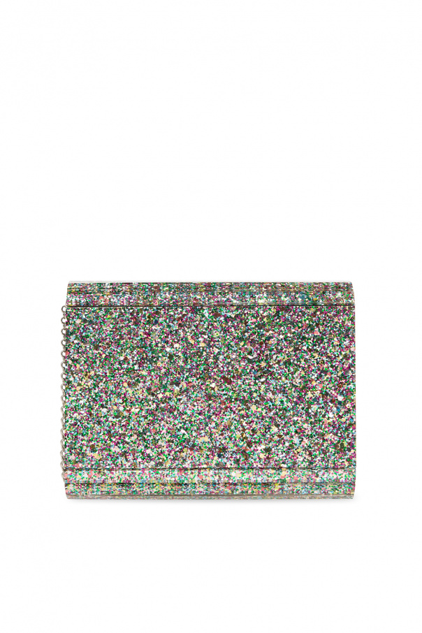 Multicolored ‘Candy’ glittered clutch from Jimmy Choo. Crafted from transparent plexiglass, this model is complete with a magnetic closure, engraved logo, detachable chain, silver-tone metal hardware and one internal compartment with lamb leather and silver-tone satin lining as well as one slip pocket.