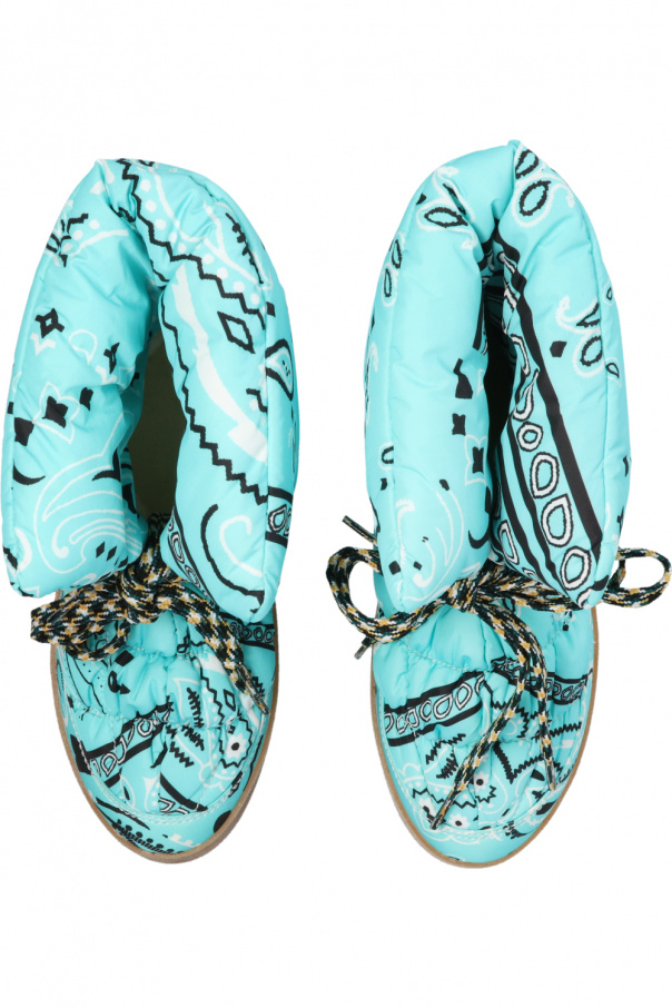 Blue, black and white snow boots from Khrisjoy. Embellished with a paisley motif, this lace-up model features a white logo print and a brown rubber sole.
