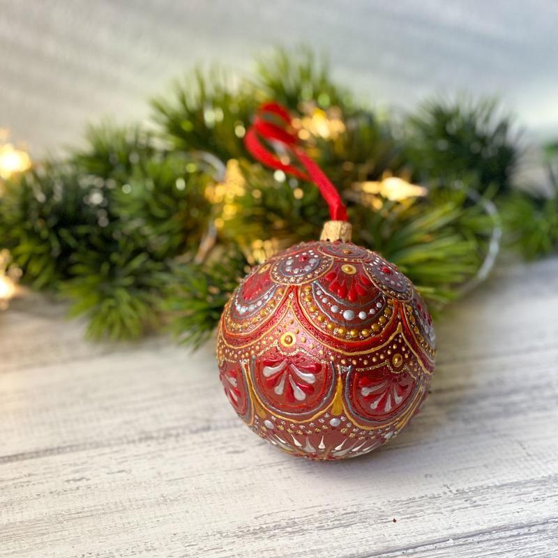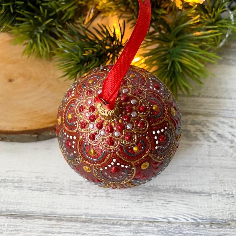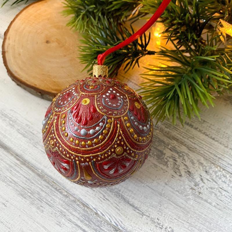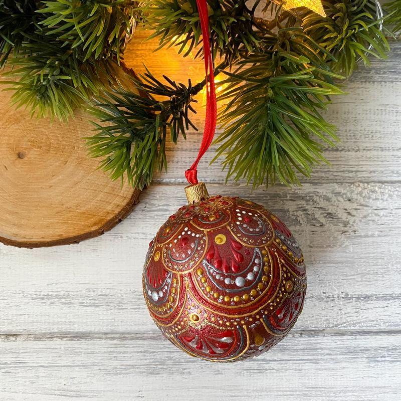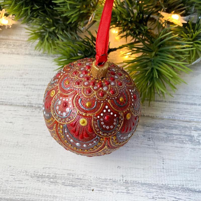 Новорічна іграшка з абстрактним ручним розписом в стилі дот-арт. В роботі я використовувала глітер та стрази, які красиво переливаються та блистять, що створює чарівну святкову атмосферу.