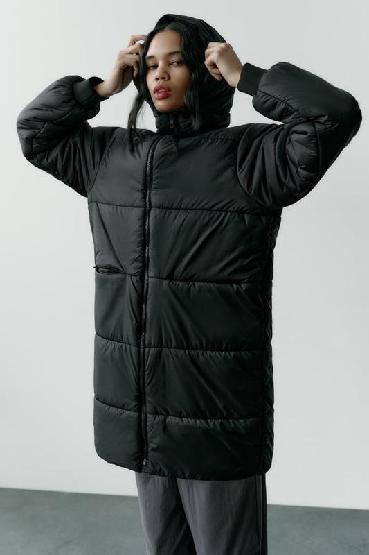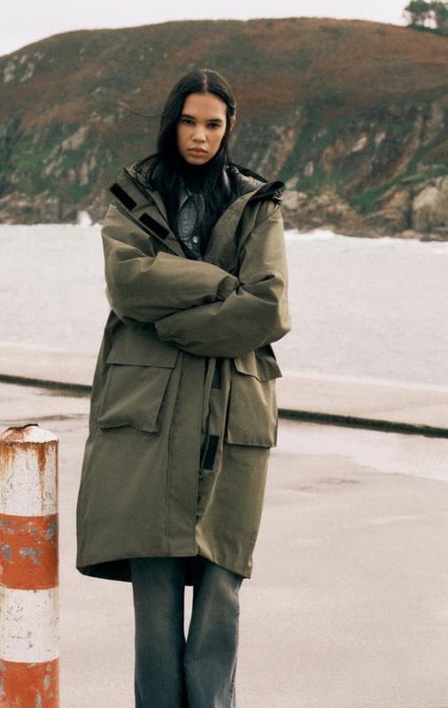 Довга водовідштовхувальна парка з високим коміром і регульованим капюшоном з еластичною завʼязкою і стопором.Має внутрішню підкладку чорного кольору,яку можна носити окремо. Довгі рукави з манжетами на липучках. Передні накладні кишені з клапанами і бічними
