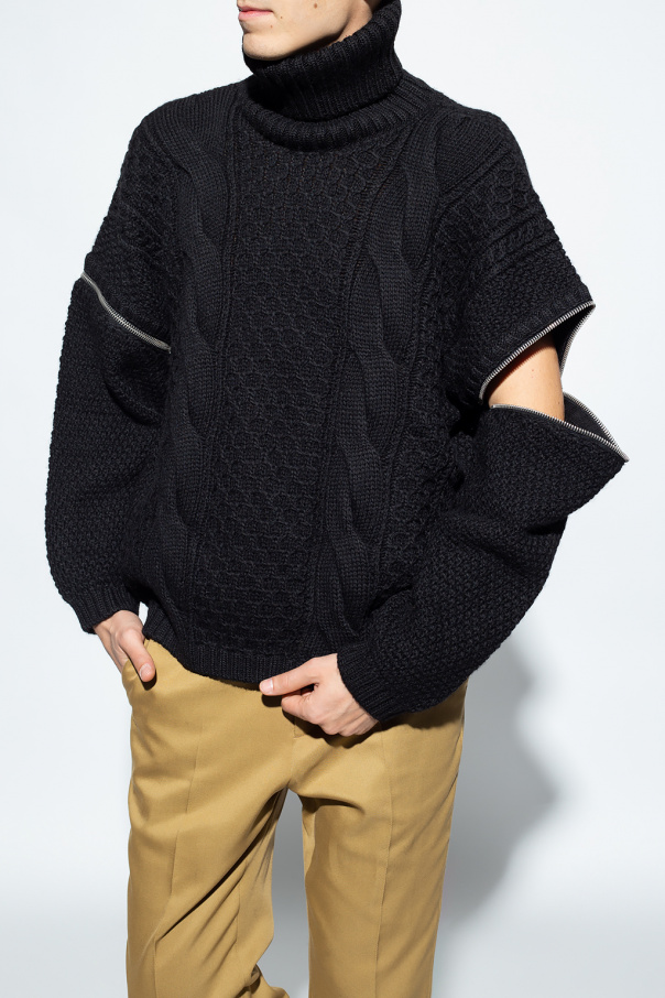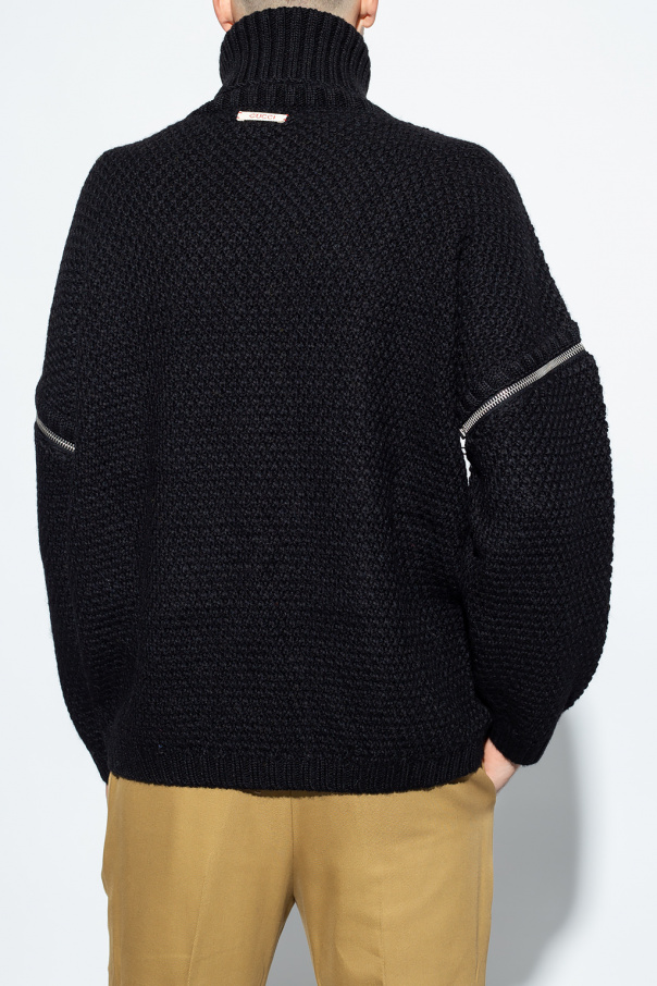 Black turtleneck sweater from Gucci. Made of wool with a decorative knit, this style features a back logo patch, a snug collar, detachable long sleeves and ribbed edges.
