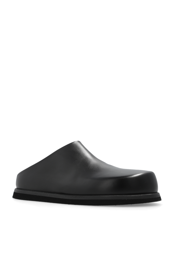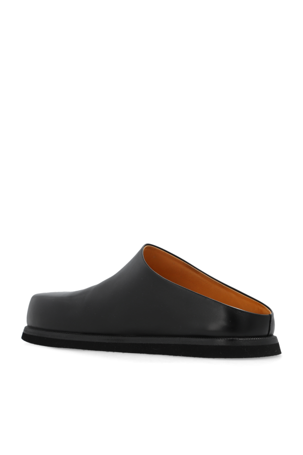 Black slides from Marsell. Made of leather, this model sits on a black rubber sole and features an almond-shaped toe.
