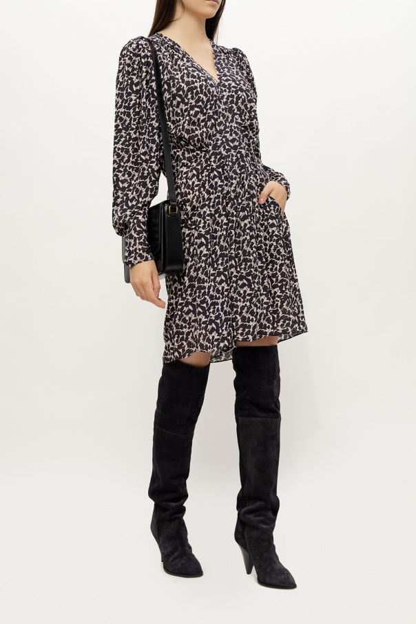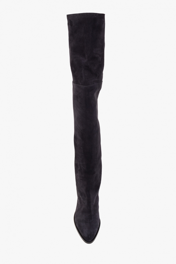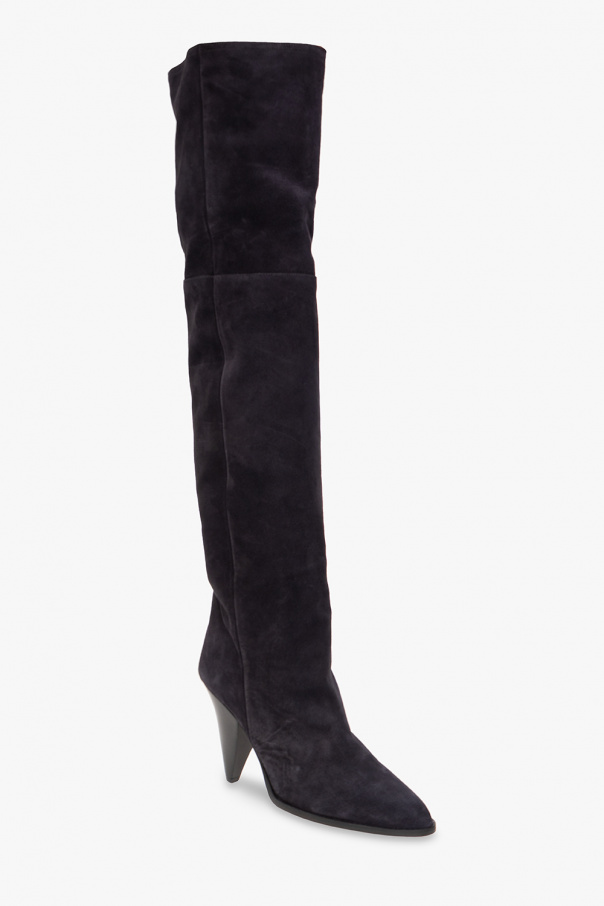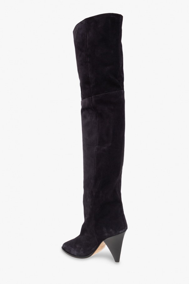 Dark navy ‘Riria’ slip-on over-the-knee boots from Isabel Marant. Crafted from calf suede, this pair features a brown cone heel and beige leather sole.