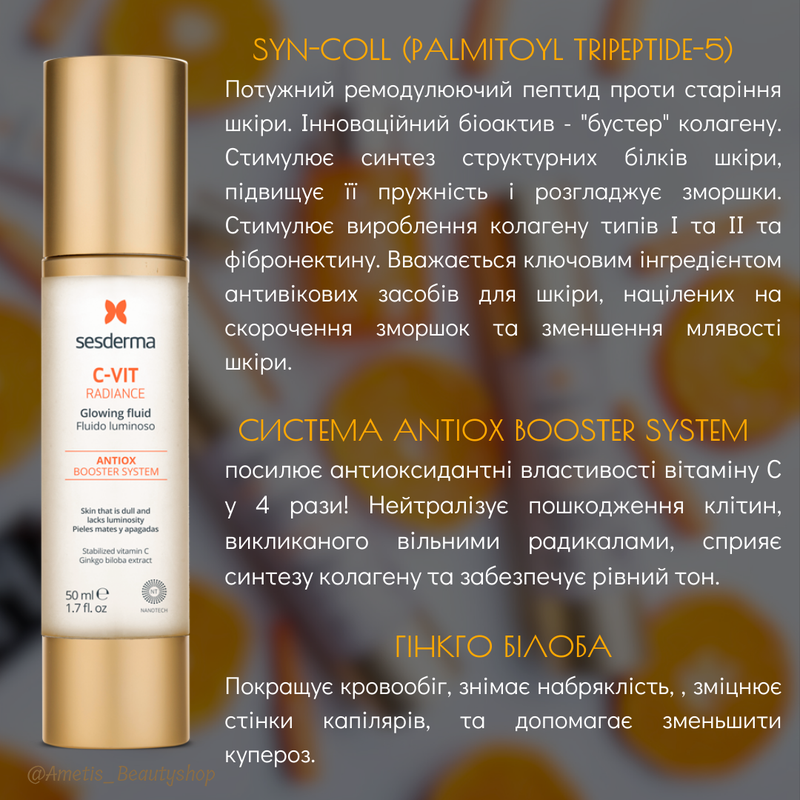 що дозволяє компонентам у найкоротші терміни проникати у глибокі шари шкіри та максимально підвищувати ефективність!📍 Активні інгредієнти: стабілізований вітамін С (3-О-етил аскорбінова кислота), система Antiox booster (гінко білоба, птеростильбен, кверцетин), пальмітоїл трипептид-5, освітлюючий комплекс, сяючі пігменти