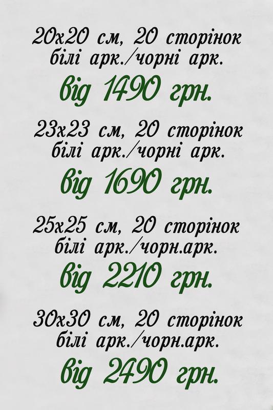 13х18 см - 40-80 шт.Вартість вказано за альбом на 10 аркушів (20 сторінок) розмір 20х20 см.