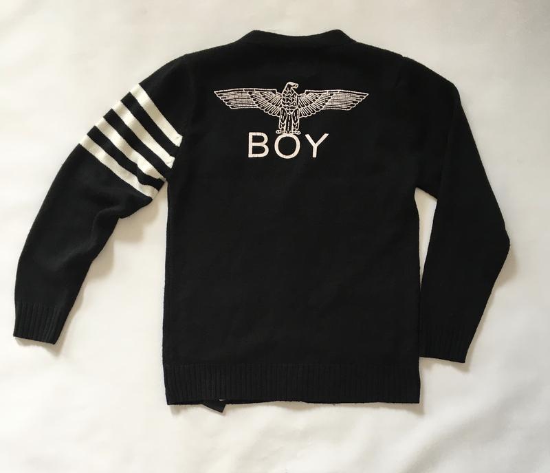 Оригінальний кардиган Boy London.Колір чорний з білими полосками на лівому рукаві.Маленьке лого спереду та велике на спині.Склад матеріалу не вказано,судячи з усього матеріал шовк.