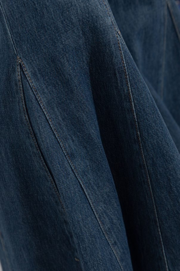 Introducing the Flared Leg Jeans by Chloé, an exquisite embodiment of the classic denim allure interlaced with a touch of modern sophistication. Crafted entirely from the finest blue denim, these jeans eschew elastic elements, endowing them with a timeless, structured silhouette. Characterized by a high-rise waist, these jeans impeccably hug the upper leg before gracefully flaring into a '70s-inspired bell-bottom from the knees down. The deep blue hue offers a versatile canvas for any ensemble, while the visible stitching and the quintessential five-pocket design enhance the jeans' inherent elegance. A leather patch adorns the back, signifying Chloé’s commitment to quality and heritage. Fastened with a zipper and button, these jeans are as functional as they are fashionable. Why Choose This Product? Timeless Design: High-rise fit with flared legs for a retro yet contemporary look. Quality Craftsmanship: Made from pure, non-stretch denim for durability and structure. Iconic Brand: Designed by Chloé, a leader in progressive and timeless fashion. Versatile Styling: Deep blue shade complements various styles and occasions.