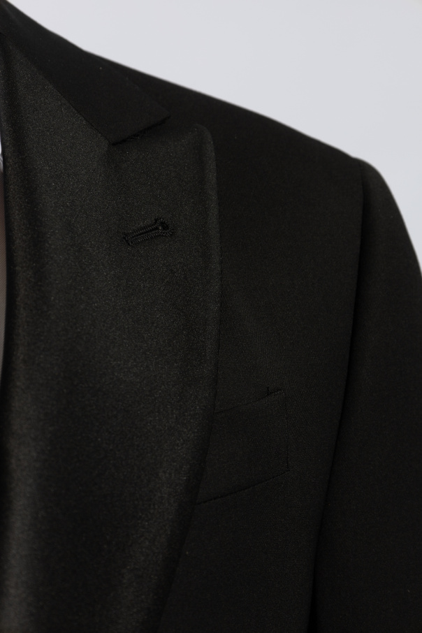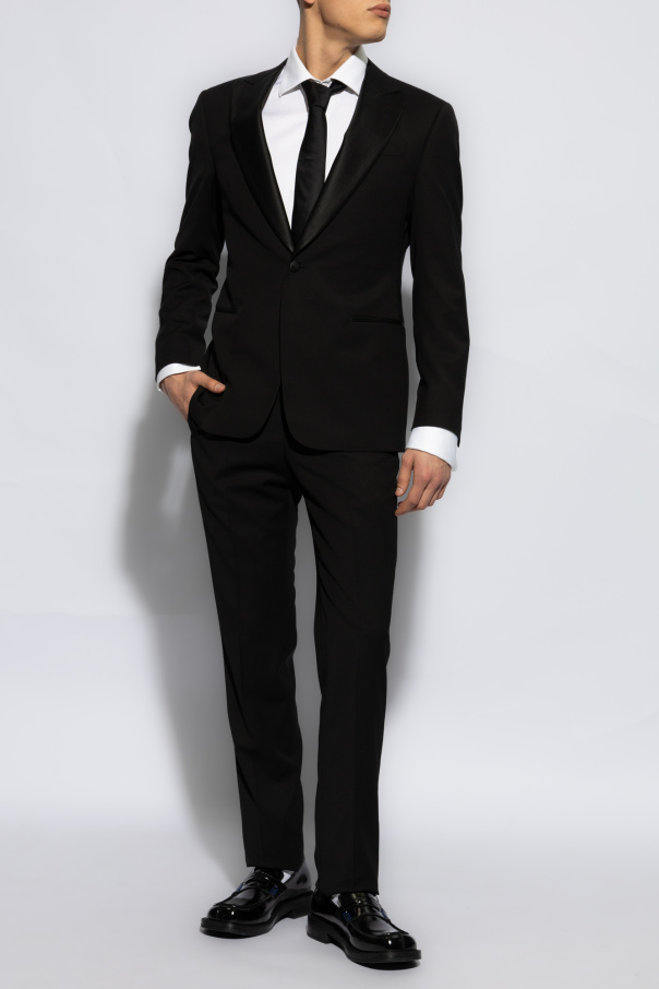 Introducing the epitome of sartorial elegance, the Giorgio Armani Wool Suit. This exquisite ensemble, meticulously crafted from 100% wool, offers an unparalleled blend of style and comfort. The outer layer's smooth, subtly lustrous fabric is complemented by a 100% viscose lining, ensuring both durability and a flawless drape. The jacket, characterized by its traditional single-breasted design and sharp peak lapels, features a two-button closure that adds a touch of timeless sophistication. The trousers, with their straight cut, embody the essence of classic tailoring, equipped with a standard zipper, button closure, and belt loops for utmost functionality. A discreet designer logo on the jacket's lapel subtly signifies the garment's exclusivity, while buttoned cuffs on the sleeves are a testament to its meticulous attention to detail. Rendered in an ever-elegant black, this suit stands as a testament to Giorgio Armani's commitment to quality and traditional style, catering to discerning clients who value exceptional craftsmanship. Why Purchase This Product? Constructed from premium 100% wool for unparalleled quality and comfort. Impeccable tailoring ensures a perfect fit and timeless appeal. Subtle designer details, such as the discreet logo, elevate the suit's exclusivity. Ideal for formal occasions, embodying classic elegance with a modern edge.