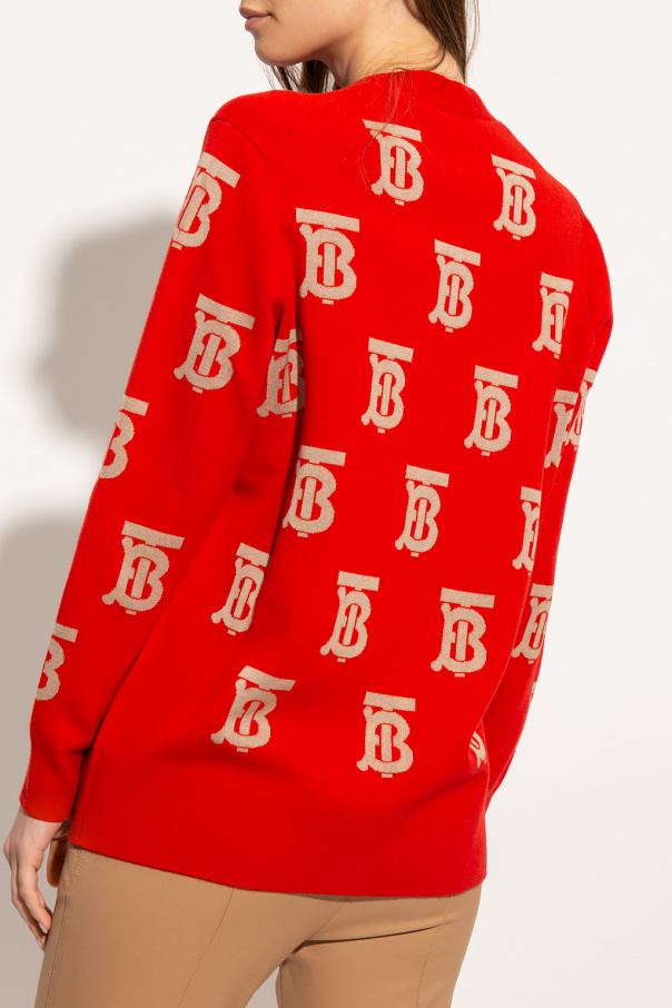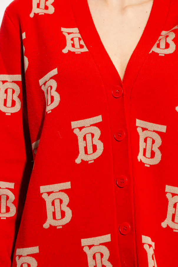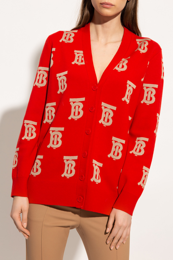 Red ‘Salena’ cardigan from Burberry. Crafted from a wool and silk blend, this style features an oversize silhouette with a beige logo pattern, button fastenings and elasticized trims on the bottom hem and cuffs.
