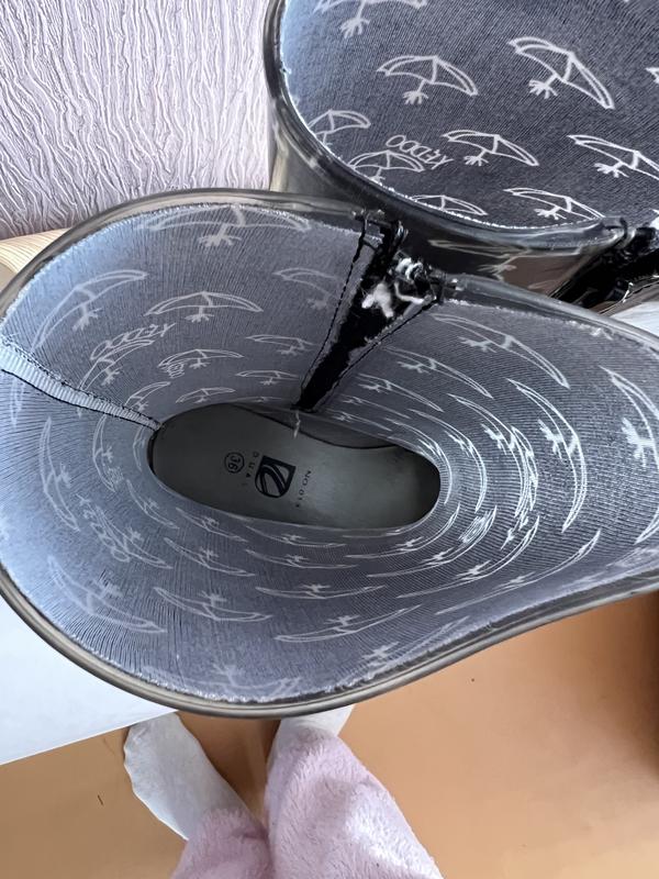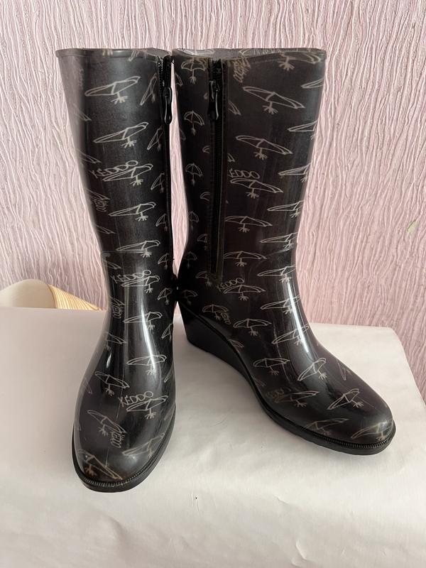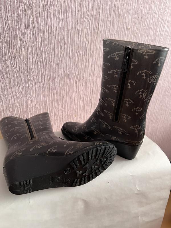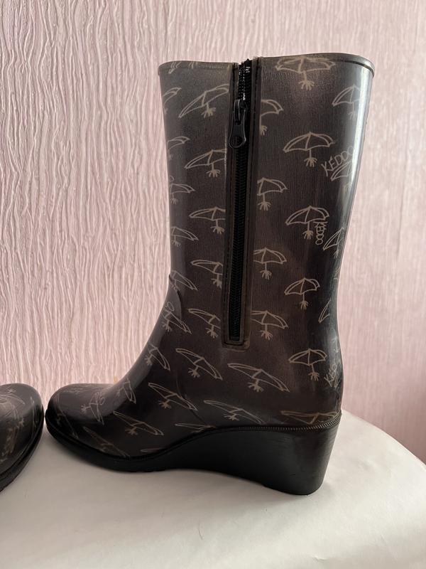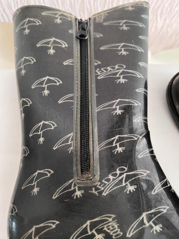 Черные резиновые сапоги. З принтом парасольками. На небольшой танкетке.