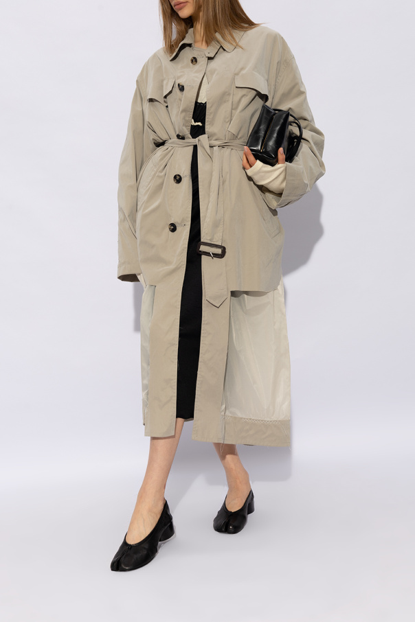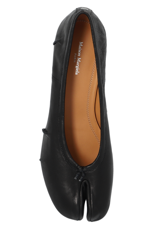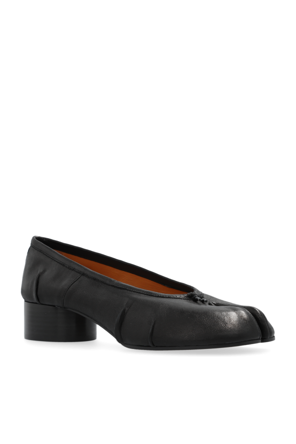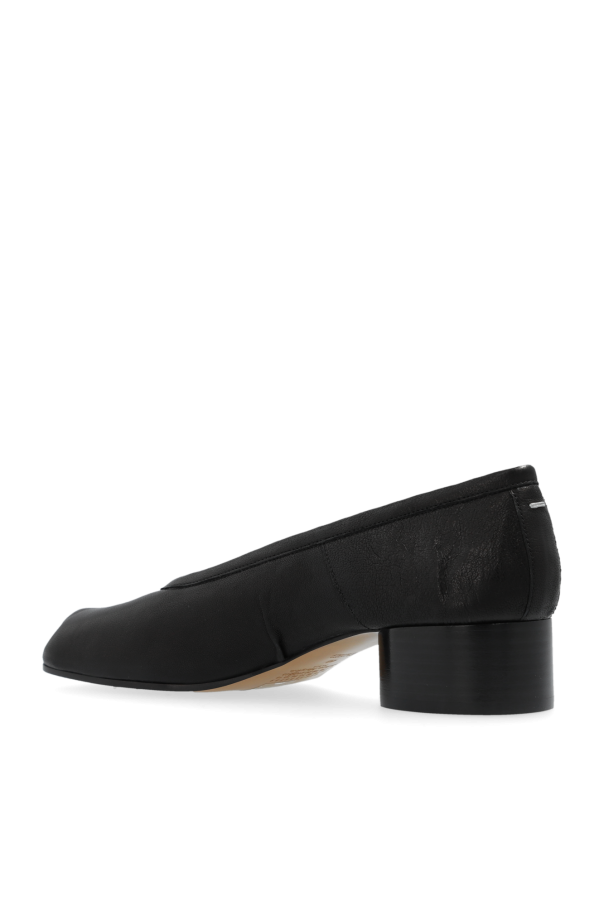 Black pumps from Maison Margiela. Made of distressed leather, this pair features the brand's signature Tabi toe, white stitches at the back and a beige leather sole.