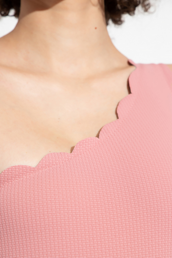 Pink ‘Santa Barbara’ one-shoulder one-piece swimsuit from Marysia. Crafted from stretchy fabric with a texture, this style features the brand's signature raw edge, hand cut scalloped edges.