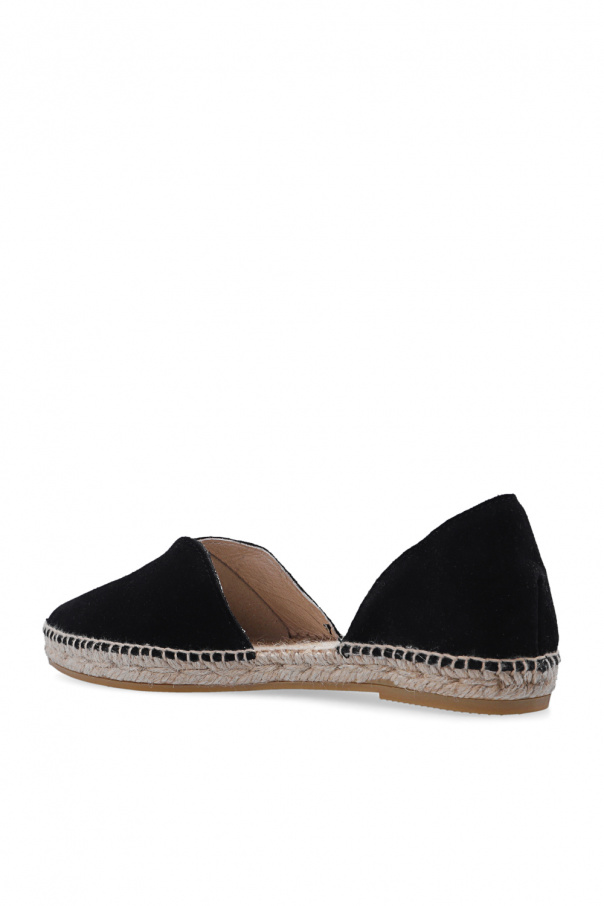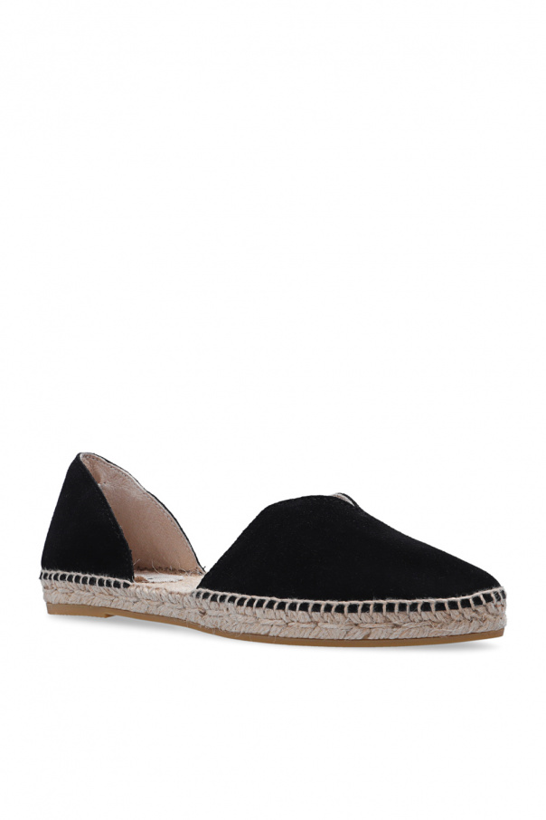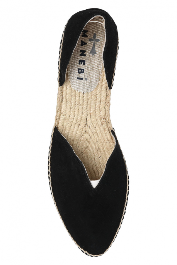 Black ‘Hamptons’ espadrilles from Manebi. Crafted from suede, this model features cut-out detailing on the front and a beige sole in woven jute and natural rubber.
