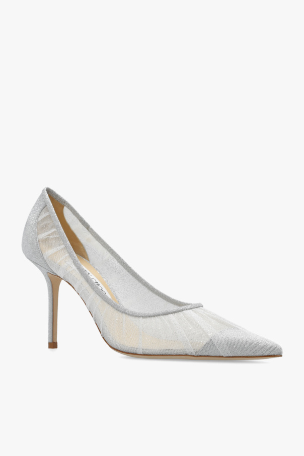 Silver-tone and white ‘Love’ stiletto pumps from Jimmy Choo. Crafted in ruched tulle and spruced up with glitter, this model features a pointed toe and a cream leather sole.