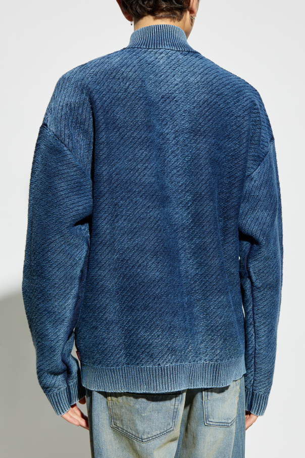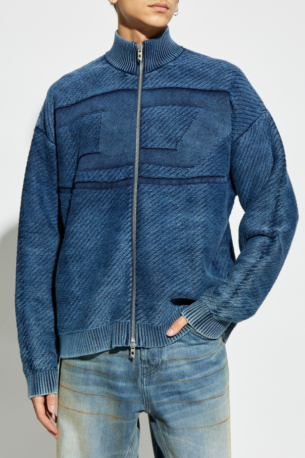 Introducing the exclusive K-KLEVERY-ZIP cardigan from the esteemed designer brand, Diesel. Crafted to perfection, this cardigan epitomizes elegance and modernity, making it a quintessential addition to any refined wardrobe. With its classic, straight cut and long sleeves, the cardigan features a sophisticated stand-up collar. The garment is made from a thick, knitted fabric with a delicate texture, adorned with geometric patterns on the front, adding a contemporary flair. Designed in a rich navy hue, the cardigan boasts a full-length zipper that extends from the hem to the collar, ensuring both style and functionality. The meticulous detailing, including a robust zipper and precise stitching at the cuffs and hem, highlights the superior craftsmanship. Why Choose This Product? Premium Material: Made from a blend of cotton, elastane, and polyamide for exceptional comfort and durability. Timeless Design: The classic cut and modern geometric patterns ensure this piece remains a staple in your wardrobe. Versatile Styling: Easily paired with a variety of outfits, from casual jeans to more formal attire. Exclusive Brand: From Diesel, a renowned name in luxury men's fashion, known for its high-quality and innovative designs.