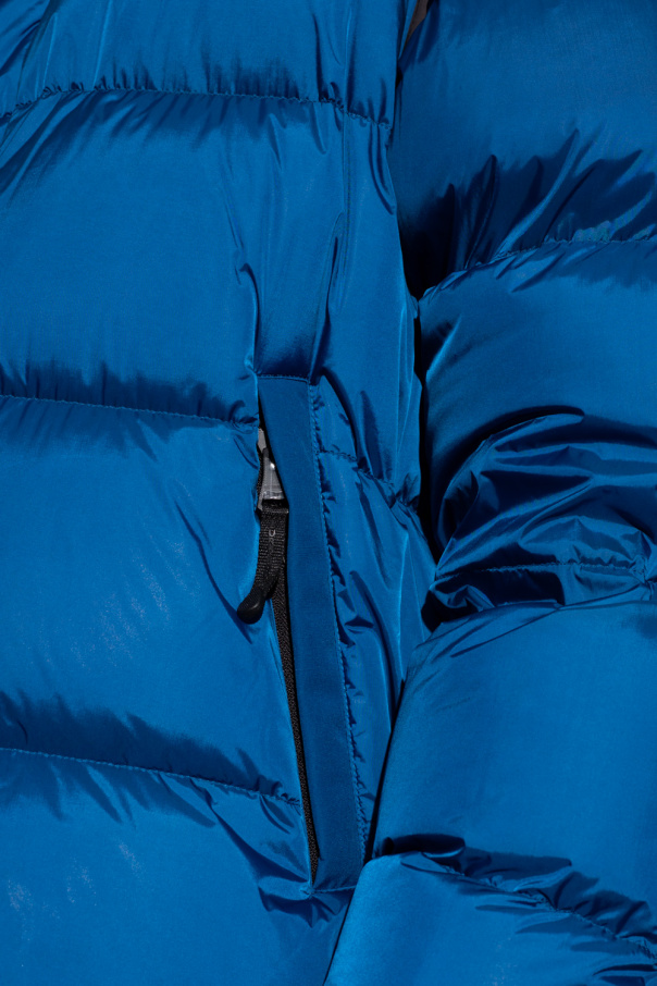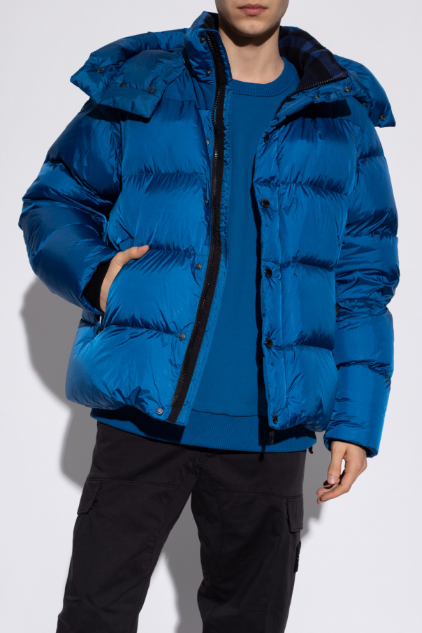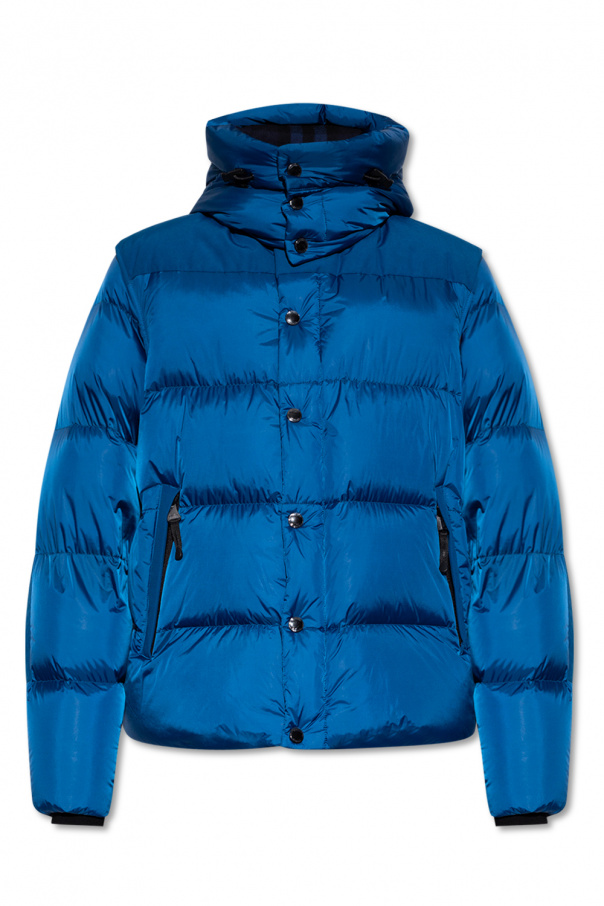 Blue down jacket from Burberry. Crafted from contrasting fabrics, this garment features a two-way zip and snaps, detachable drawstring hood, two front zip pockets, rubber logo patch and detachable long sleeves with ribbed cuffs in black.