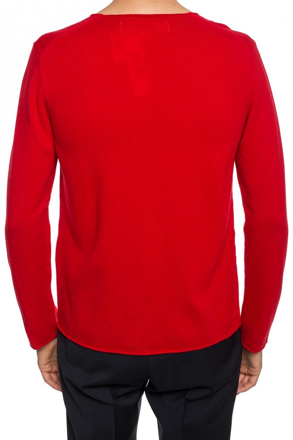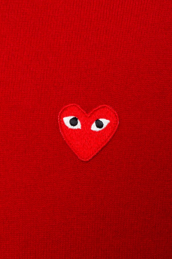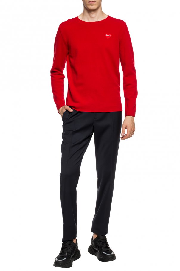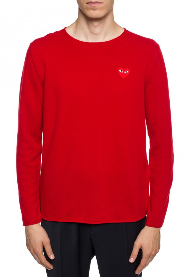 Red sweater from Comme Des Garçons Play. Made of wool. Front decorated with a heart motif patch in red, white and black. Round neck. Long sleeves.