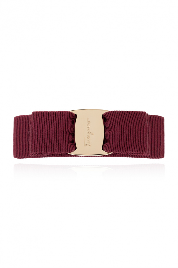 Maroon and gold-tone bow hair clip from Salvatore Ferragamo. This item features a grosgrain strap and metal logo-engraved appliqué.