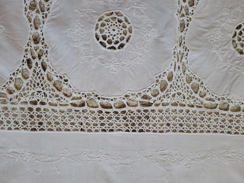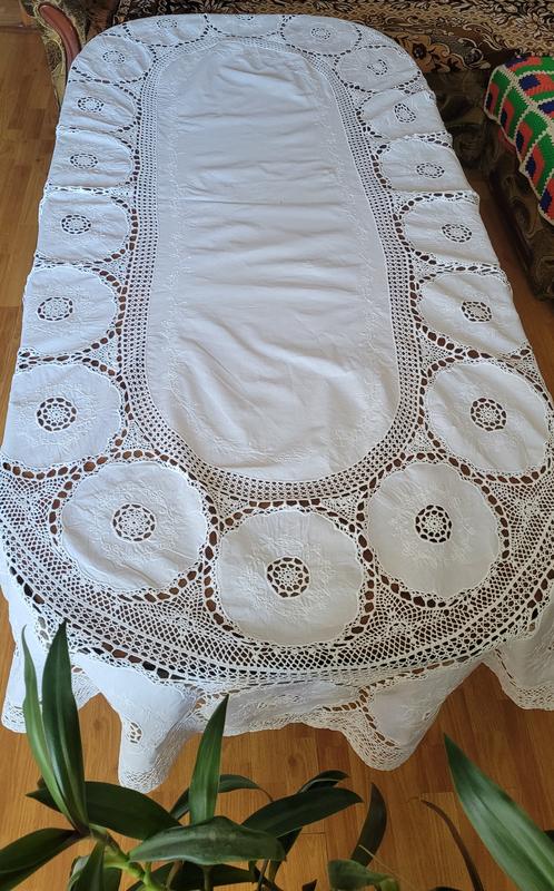 Скатертина на овальний стіл, ручна робота, техніка тканина + гачок, бавовна. Скатертина була у використанні, має невеличкий дефект ( фото 8 ) Розмір - 2 м 30см на 1 м 50 см
