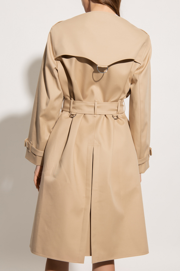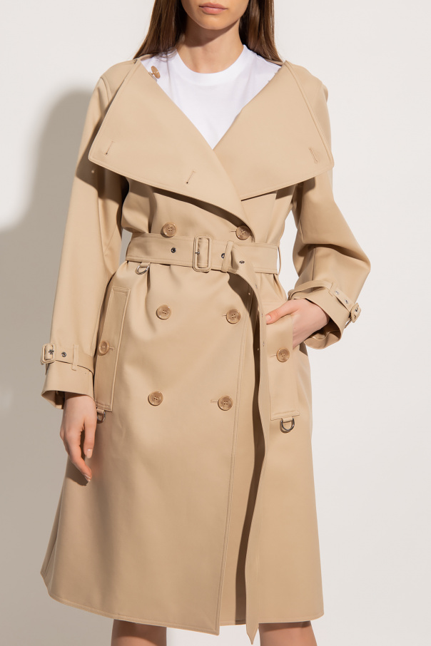 Beige double-breasted coat from Burberry. Crafted from cotton, this design features button fastenings, adjustable waist belt, decorative panels with a metal appliqué, boat neck, two buttoned pockets, single rear vent and long sleeves with an adjustable strap.