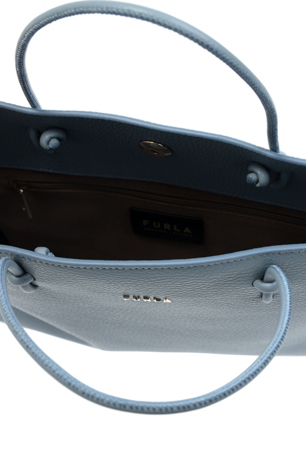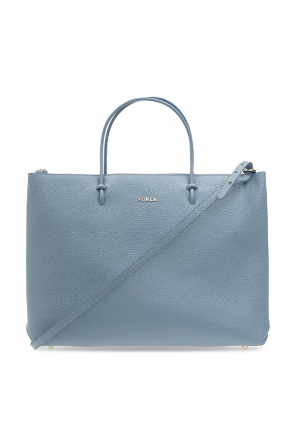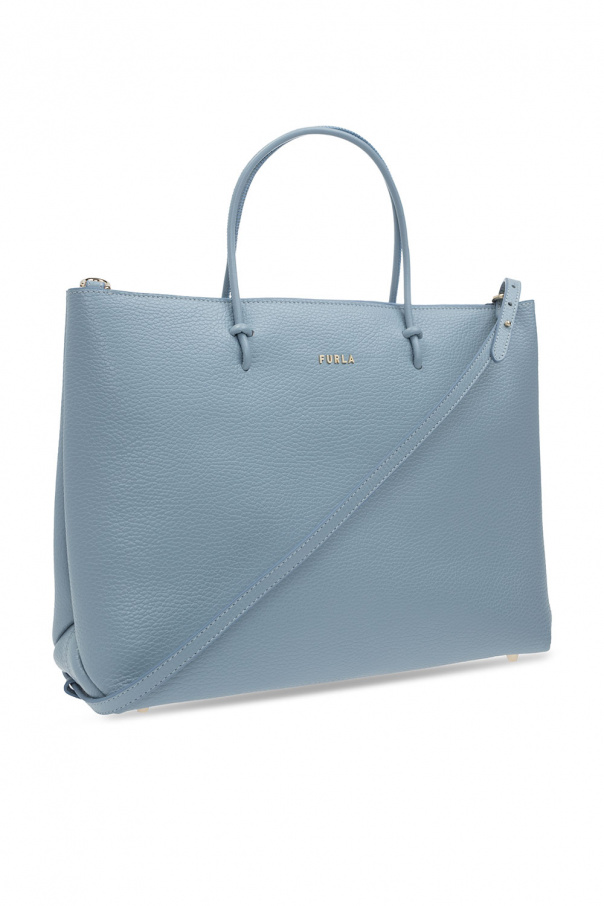 Blue ‘Essentials’ tote bag from Furla. Crafted from textured leather, this design features a raised gold-tone logo detail, two half-round handles, detachable shoulder strap and one internal compartment with one zip pocket.