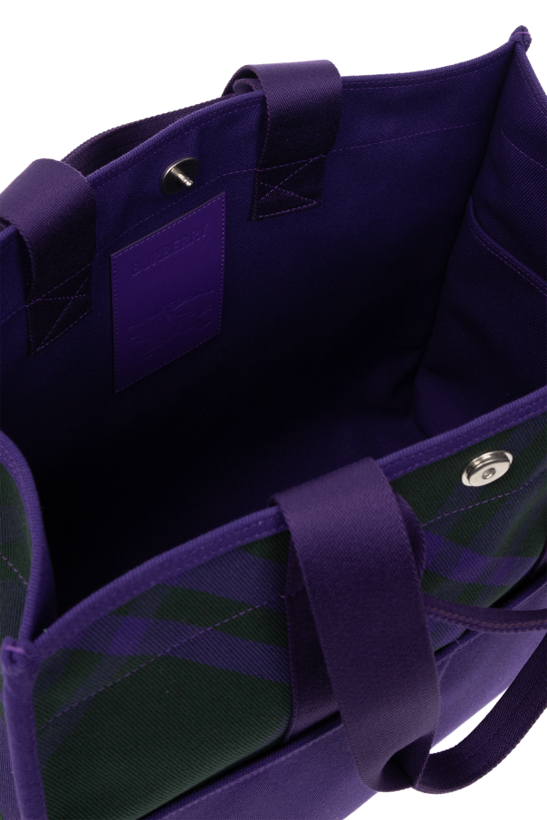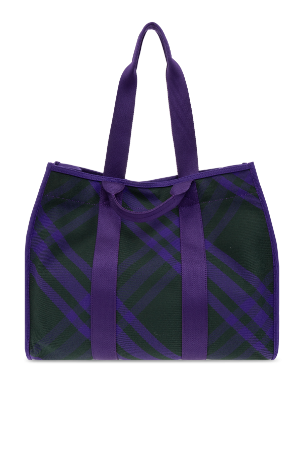 Purple and navy shopper bag from Burberry. Crafted from cotton, this design features a snap closure, check pattern, two front pockets, four half-round handles, one internal compartment and black metal hardware.