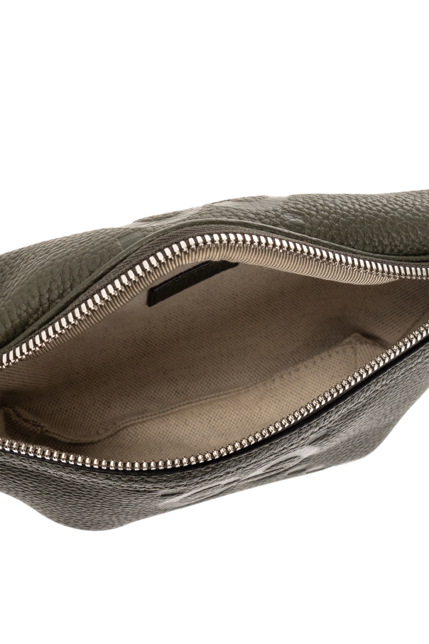 Dark green belt bag from Gucci. Made of calf leather, this design secures with a zip and showcases an embossed monogram pattern. It is complete with an adjustable strap with a buckle, silver-tone metal hardware and one internal compartment.