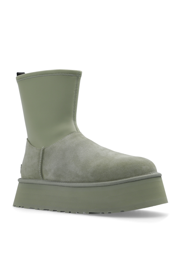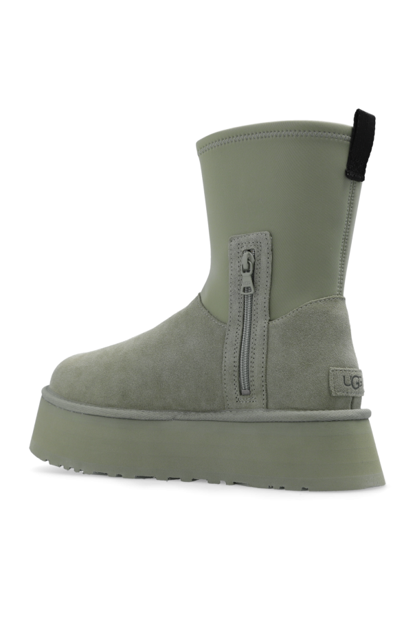 Greenish-grey ‘Classic Dipper’ platform snow boots from UGG. Made of suede and trimmed with recycled material, this model sits on a greenish-grey EVA foam sole and features a logo-embossed patch and a black pull tab on the back as well as zip fastening on the side.