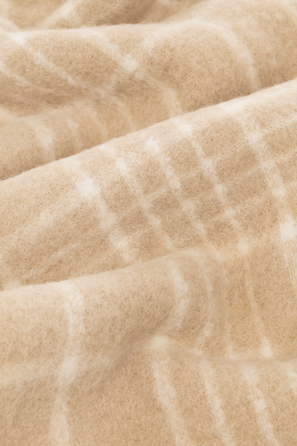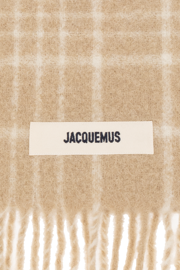 Beige and white ‘Carro’ scarf from Jacquemus. Made from a mohair, alpaca and wool blend, this item showcases a check pattern, logo patch and fringe edges.