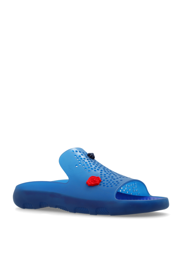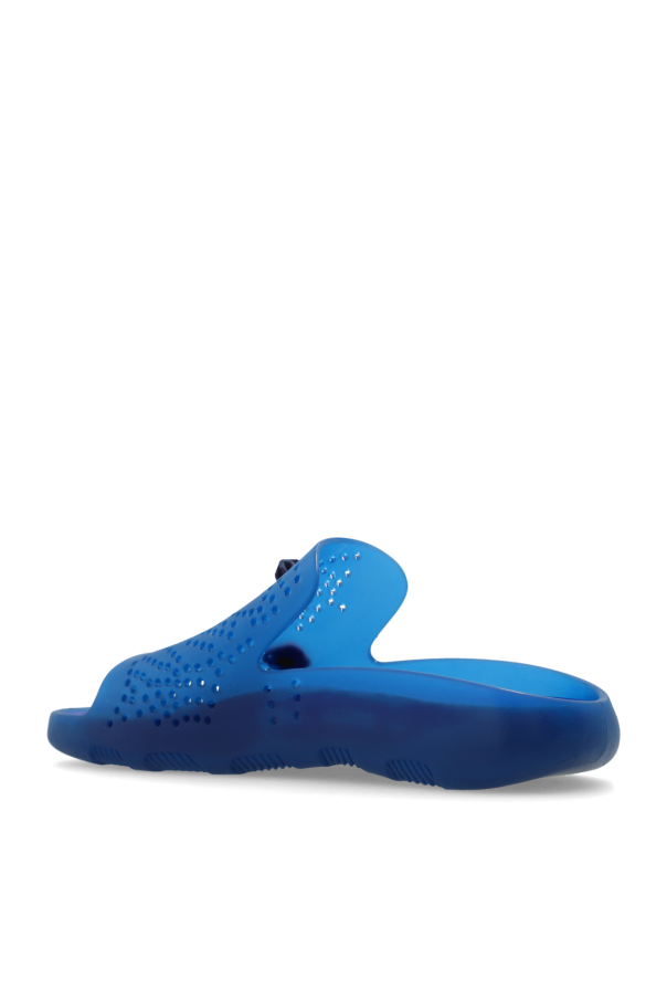 Introducing the ‘Stingray’ High-Heeled Slides by Burberry, an epitome of refined elegance and innovative design. Crafted from 100% rubber, these slides offer unparalleled durability and resistance to weather elements, ensuring they remain your cherished wardrobe staple for seasons to come. The classic silhouette, characterized by a single wide strap across the midfoot, is reimagined with distinctive perforations, adding a layer of intrigue and uniqueness. The matte finish complements the vibrant blue hue, making these slides a versatile addition to any ensemble. A standout red floral motif, possibly a logo or an ornamental accent, adorns the strap, infusing the design with Burberry’s iconic flair. The sole’s honeycomb pattern not only enhances grip but also introduces an element of aesthetic appeal. Additionally, the interior patterns may serve a dual purpose of foot massage while wearing, marrying comfort with style. Styled casually with loose trousers and a shirt, the ‘Stingray’ slides demonstrate their adaptability, effortlessly transitioning from daywear to an elevated evening look. Why Purchase This Product? Durable Material: Crafted from high-quality rubber, ensuring longevity and ease of maintenance. Unique Design: Perforated strap and honeycomb pattern sole add distinctive charm. Comfort Meets Style: The thoughtful interior design offers comfort, while the bold blue color and decorative elements provide style. Versatile Wear: Perfect for various occasions, from casual outings to more formal events.