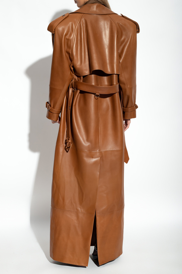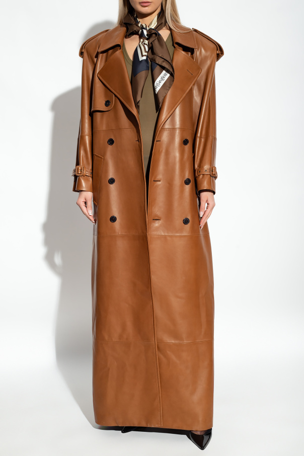 Brown trench coat from Saint Laurent. Crafted from lamb leather with a double-breasted silhouette, this style is cinched with a buckle belt at the waist and features button fastenings, shoulder epaulettes, two frontal pockets, long sleeves and a single back vent.