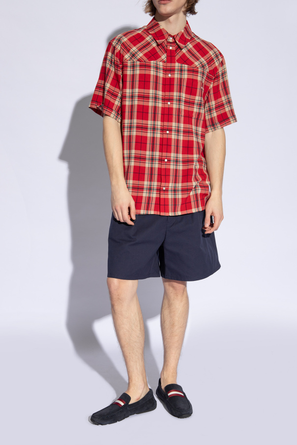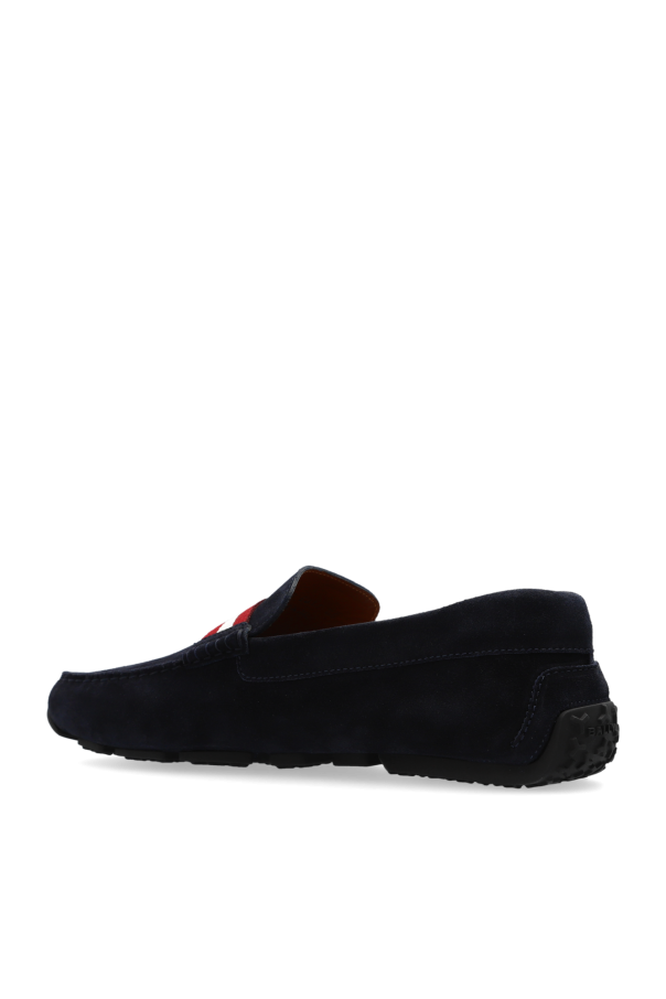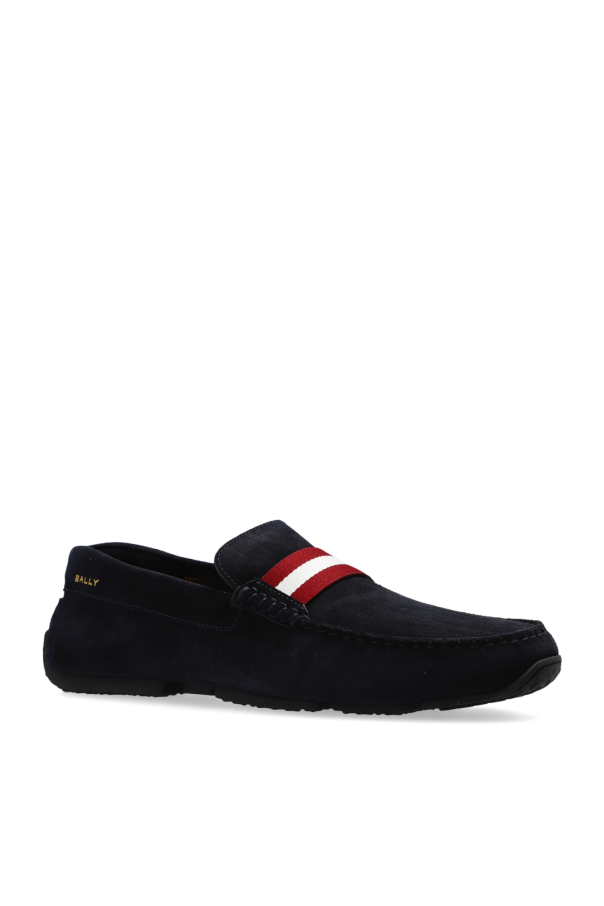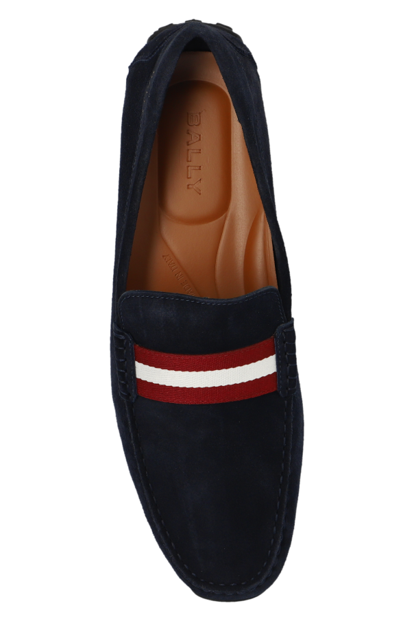 Navy ‘Perthy’ moccasins from Bally. Made of calf suede, this pair features the brand’s signature stripe in maroon and cream as well as gold-tone logo print on the side and a black rubber sole.