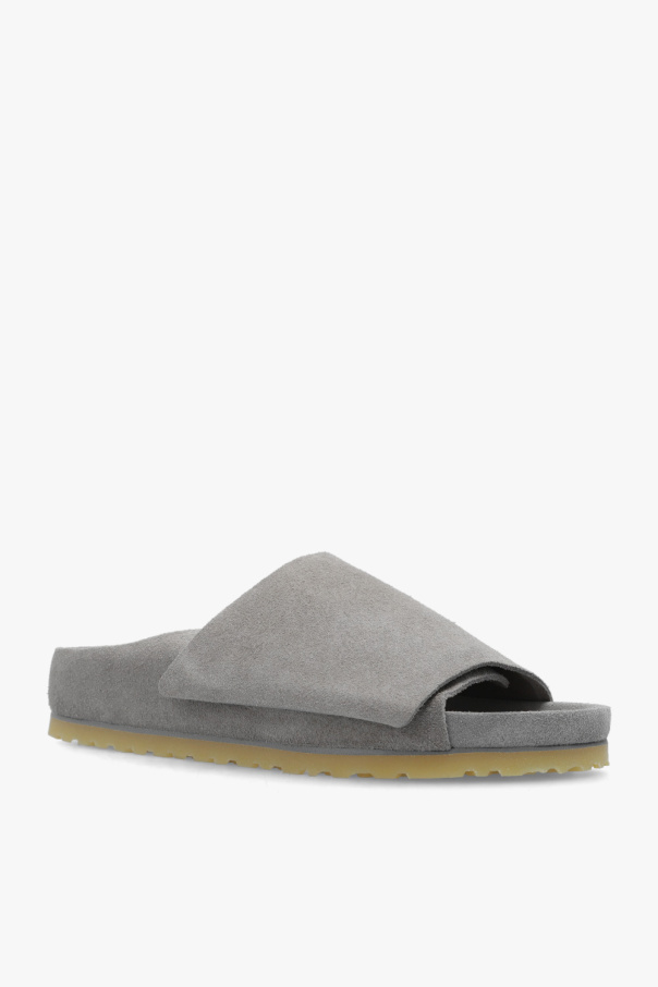 Grey ‘Los Feliz’ slides from Birkenstock X Fear Of God. Crafted from suede, this model sits on a translucent rubber sole in yellowish beige and features a velcro closure, an embossed logo on the side and the brand's signature anatomically shaped cork-latex footbed.