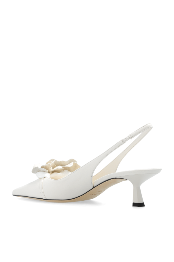 Cream ‘Amita’ pumps from Jimmy Choo. Crafted from leather, this design features an elastic heel strap, pointed toe with a flower detail and light beige leather sole.