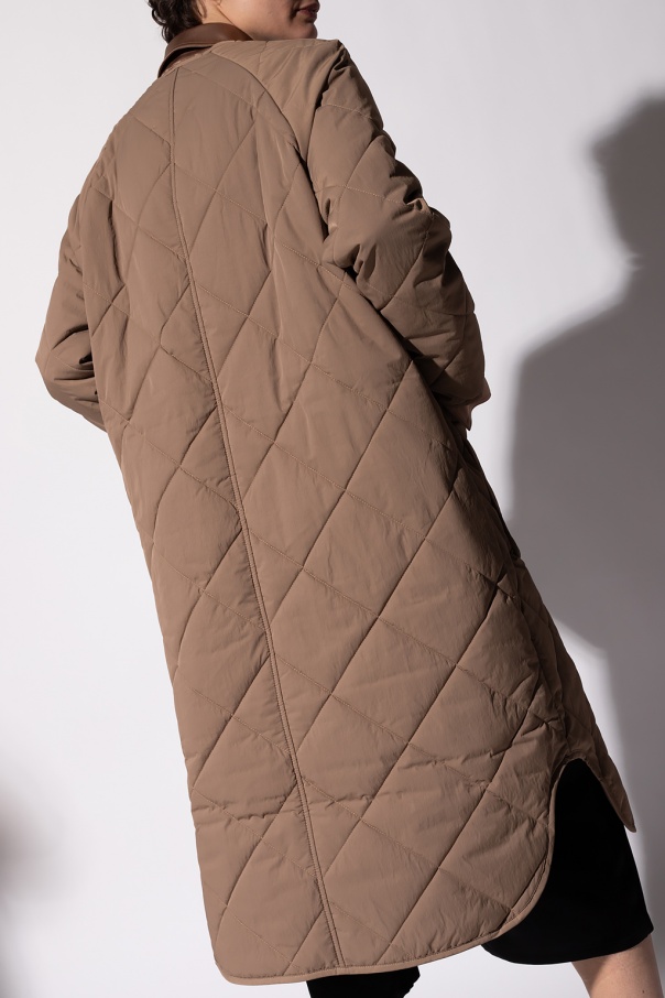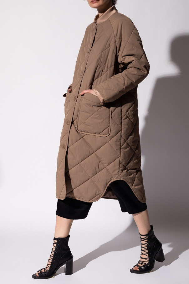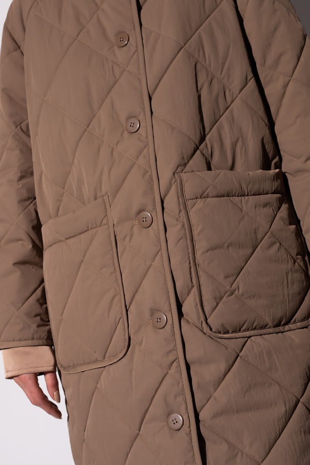 Light brown quilted coat from Samsoe Samsoe. Fastened with buttons, this garment is complete with two slip pockets.