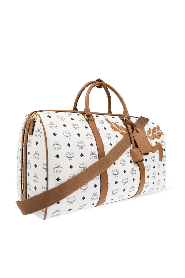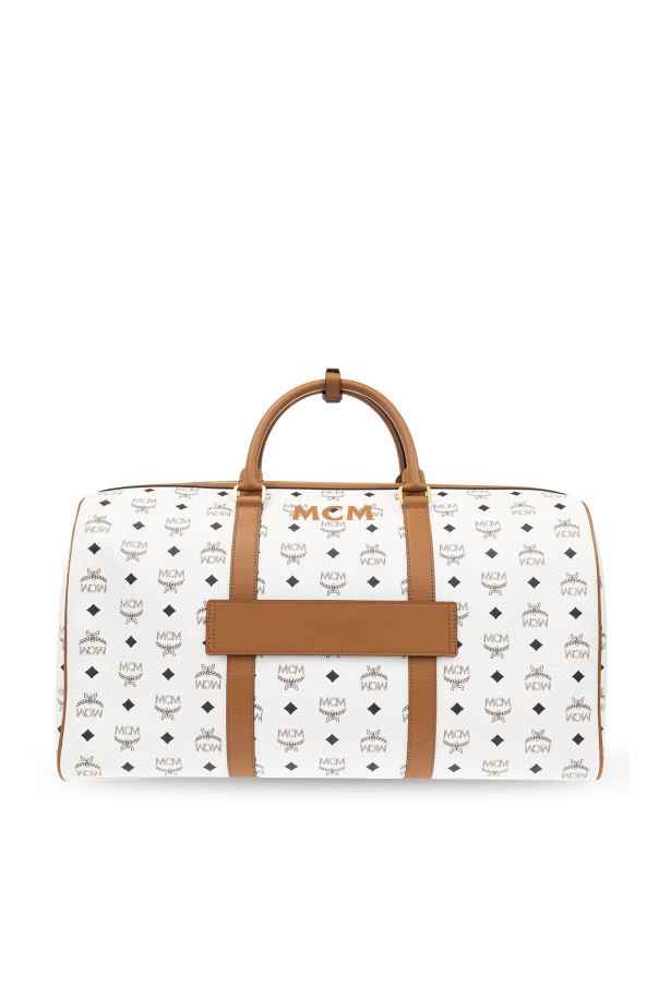 White and brown ‘Ottomar’ travel bag from MCM. Made of coated canvas with a black Visetos monogram and leather trims, this model fastens with a two-way zip and is decorated with a logo print. It is complete with a handle at the back, ID tag, padlock with keys, two half-round handles with a snap fastening, detachable and adjustable shoulder strap, metal hardware plated with 24k gold and one internal compartment with two slip pockets and one zip pocket.