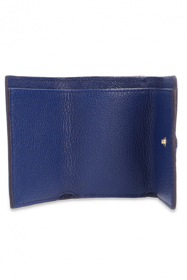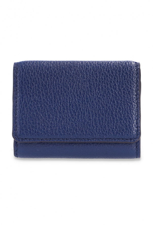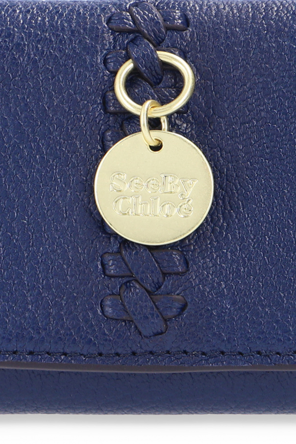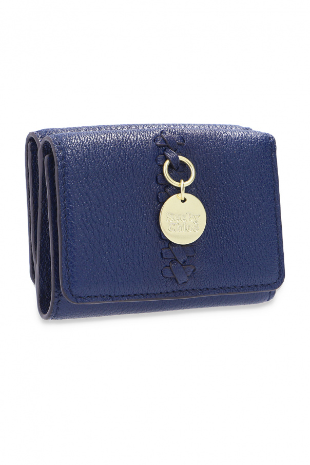Navy blue folding wallet from See By Chloé. Crafted from grainy leather, this item fastens via a snap and showcases a gold-tone charm with an embossed logo, a snap-fastened coin pocket at the back and three card slots and a bill compartment inside.