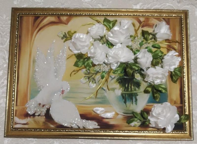 Картина выполнена на качественном принте атласными лентами методом аппликации и вышивки лентами. Это подарок- молодожёнам, на годовщину свадьбы или на любой юбилей...