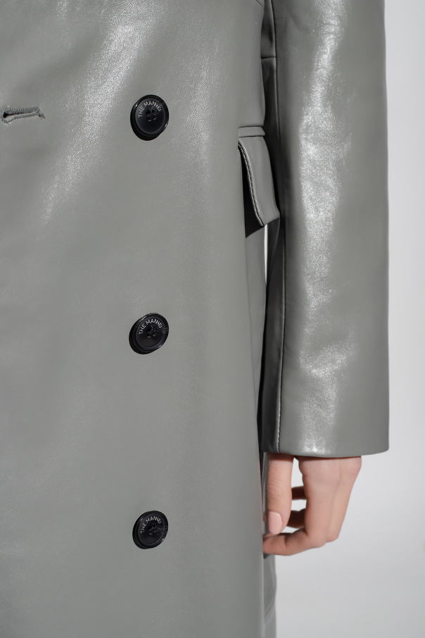 Grey ‘Greenock’ coat from The Mannei. Crafted from leather with a double-breasted silhouette, this style features button fastenings, long sleeves, three frontal pockets – two flapped ones, and a single back vent accompanied with a buttoned pocket.