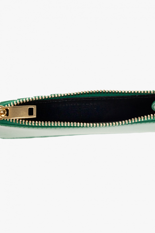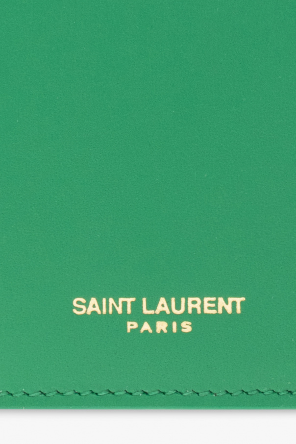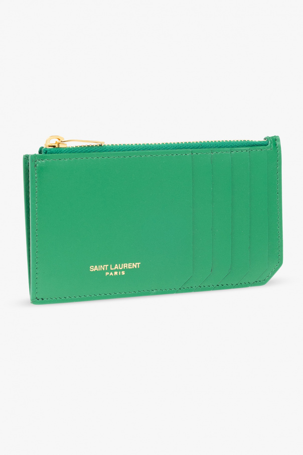 Green card holder from Saint Laurent. Crafted from calf leather, this item is decorated with an embossed logo in gold-tone and has five card slots and a zip pocket.