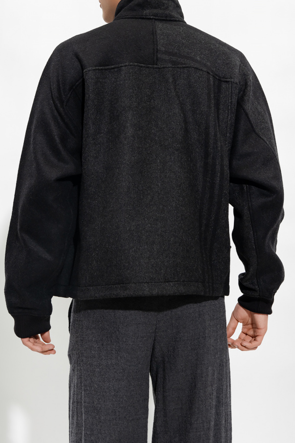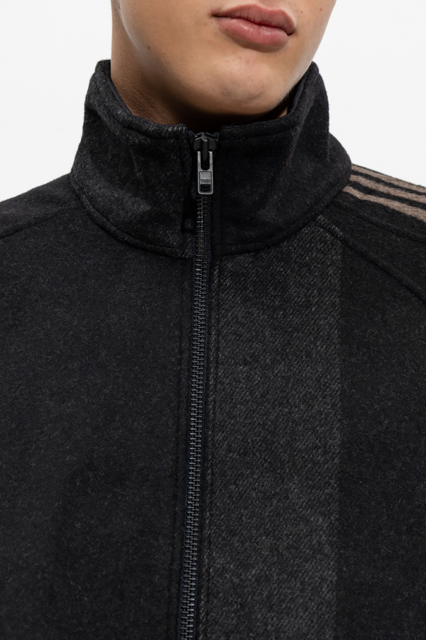 Black and grey jacket with a stand collar from Y-3 Yohji Yamamoto. Crafted from a wool blend, this garment features a two-way zip, the brand’s signature three stripes, two zip pockets, drawstring hem and long loose-fitting sleeves with ribbed cuffs.