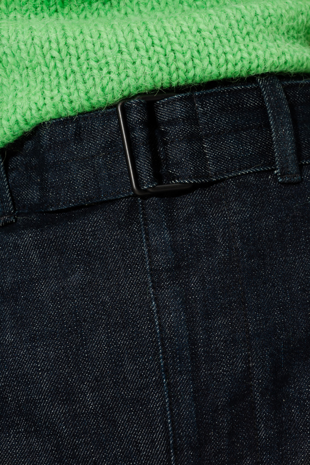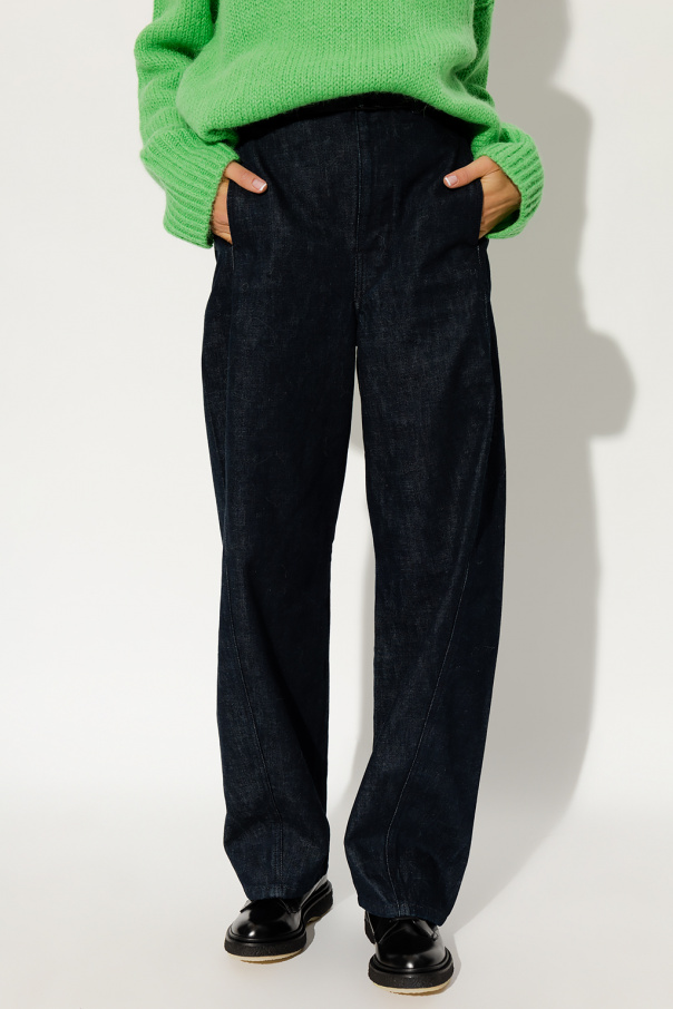Navy high-waisted jeans from Lemaire. Fastened with a zip, hook and button, this pair features a buckled waist belt, two front pockets, two back pockets and wide, slightly tapered legs.