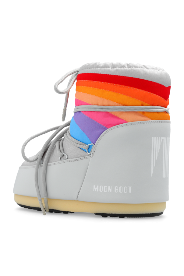 Grey ‘Icon Low Rainbow’ waterproof snow boots from Moon Boot. Set on a black and cream rubber sole with suction pads that offer serious ground control, this pair features criss-cross tubular laces (not to be used to tighten boots), elasticated cuffs, rainbow motif, a logo and silver-tone metal hardware. Inspired by the peculiar shape and technology of the astronauts' boots, the iconic style was designed in 1969 after the first Moon landing.