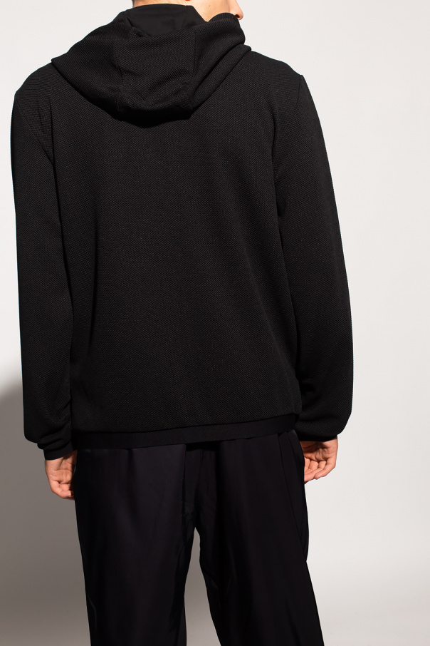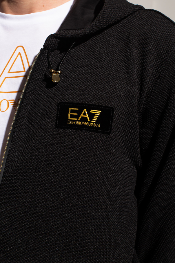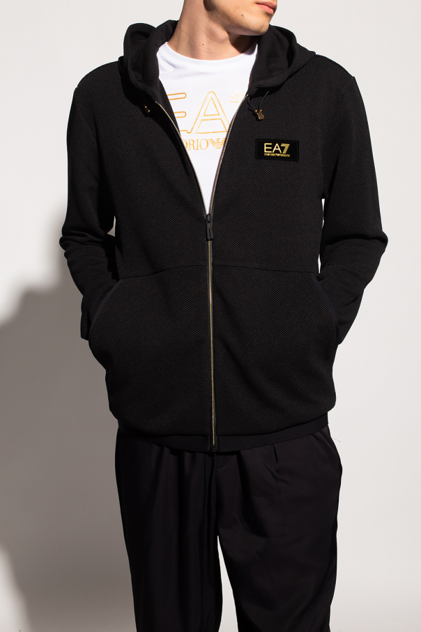 Black hoodie from EA7 Emporio Armani. Fastened with a zip, this garment is complete with a drawstring hood, two slip pockets, black patch with a gold-tone logo and elasticated hem and cuffs.