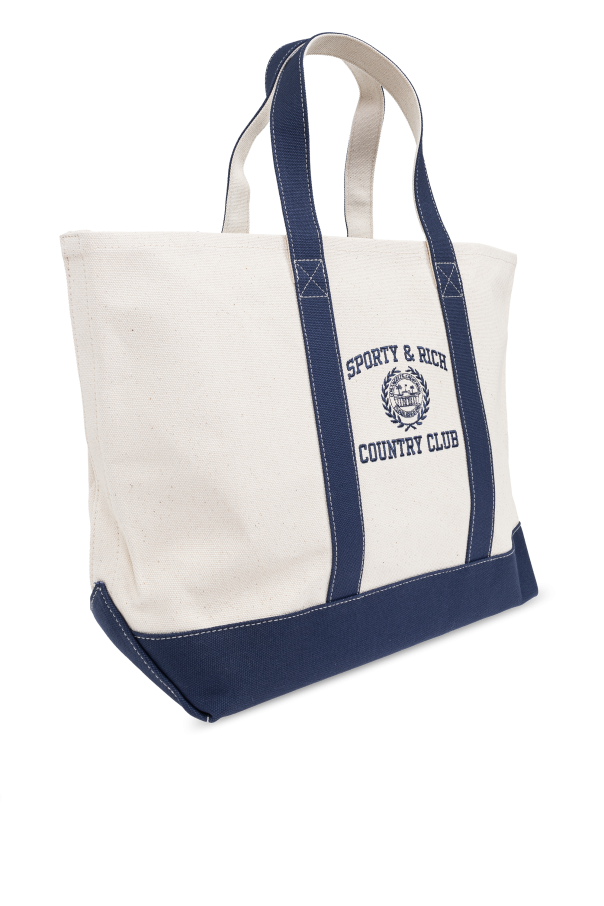 Introducing the Sporty & Rich Shopper Bag, a testament to understated elegance and durable design. Crafted from 100% premium cotton canvas, this beige and navy bag marries functionality with style, making it a perfect companion for your daily endeavors. The bag's front is adorned with the distinctive "SPORTY & RICH" print, encircling a navy emblem reminiscent of a classic sports club logo, which adds a touch of sophistication and exclusivity. Its wide, flat navy handles not only contrast beautifully with the bag's body but are also meticulously attached, with visible stitches that hint at hand-finished quality and enhanced durability. The interior reveals a neatly placed, small white label featuring the designer's name, a hallmark of authenticity and luxury. An additional feature is the inner slip pocket, perfect for organizing your essentials. The bag's navy bottom not only provides a striking contrast but also offers practical protection against dirt and wear. Whether showcased against a white backdrop or modeled for its scale and versatility, this shopper bag stands out as a functional yet fashionable accessory, spacious enough for shopping hauls or carrying larger items. Why Choose This Product? High-Quality Material: Made from durable 100% cotton canvas. Exclusive Design: Features the unique "SPORTY & RICH" and sports club emblem. Durable Construction: Solid stitching and hand-finished touches ensure longevity. Practical Features: Includes an inner slip pocket for organization. Stylish Contrast: Navy accents provide a sophisticated contrast.
