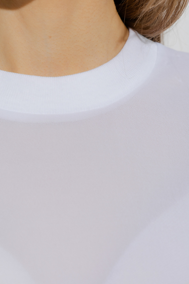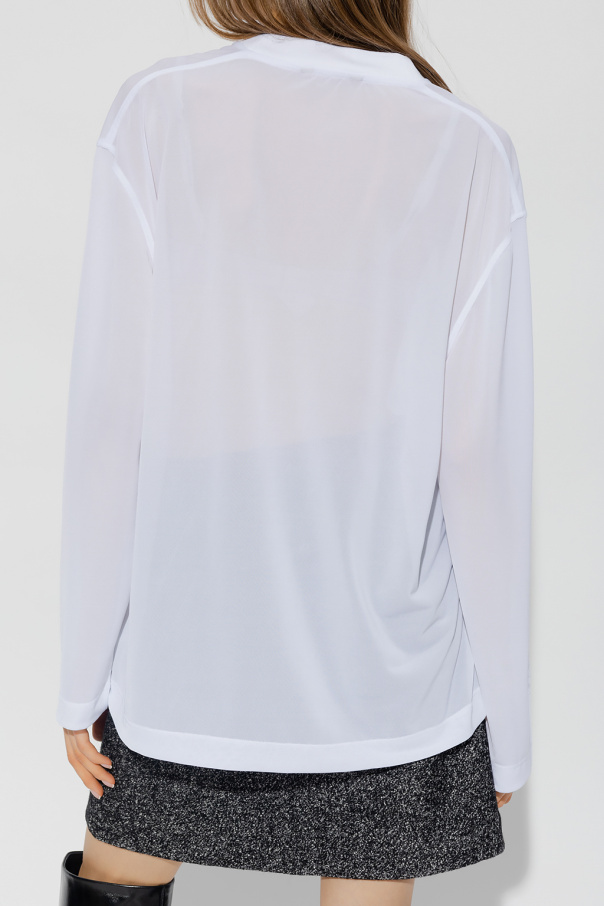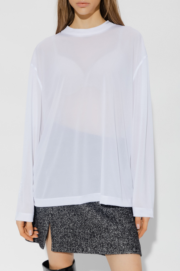 White ‘W. Spectre LS’ sheer top from Holzweiler. This loose-fitting design features a ribbed round neck and long sleeves embroidered with a logo pattern.