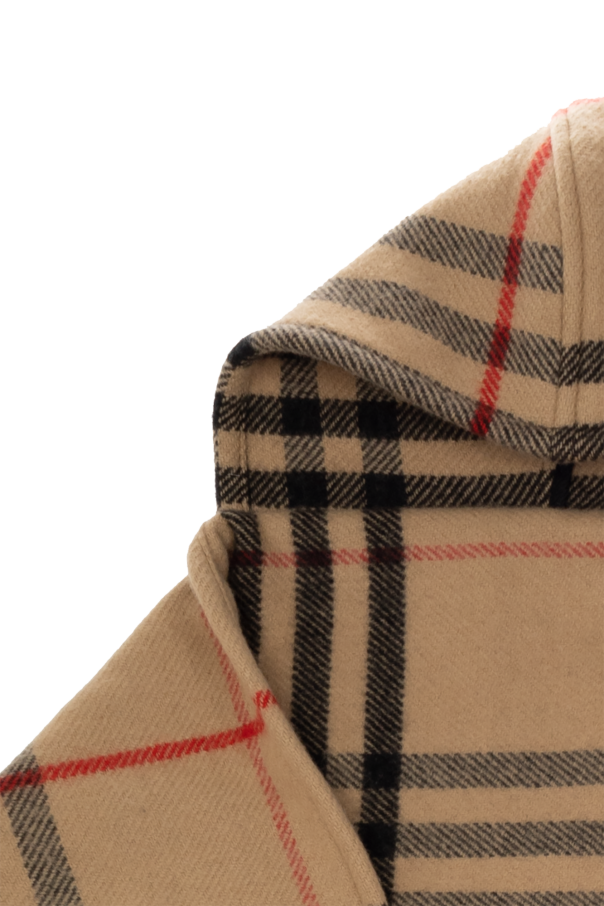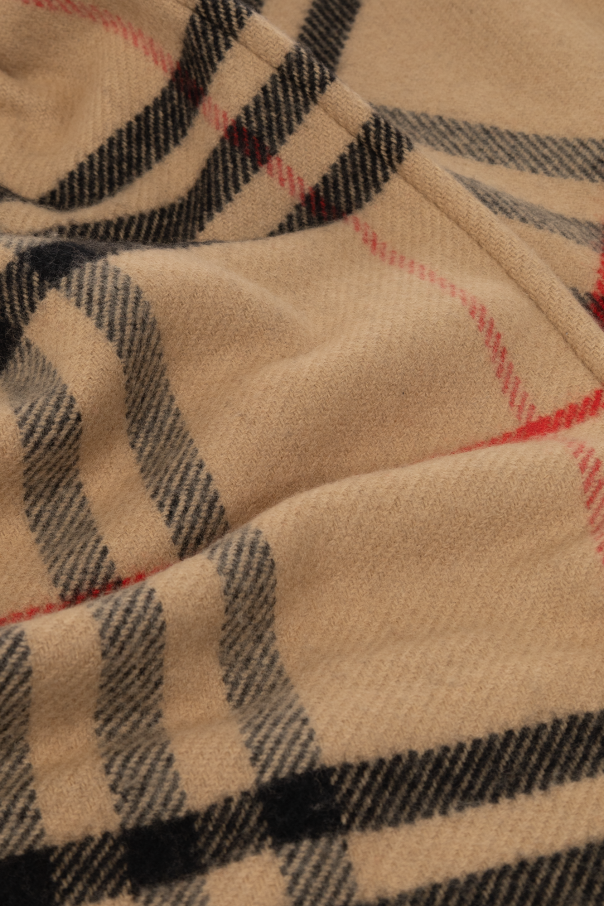 Beige hooded scarf from Burberry. Made from a wool and cashmere blend, this design features the brand’s iconic multicolored check and fringes.