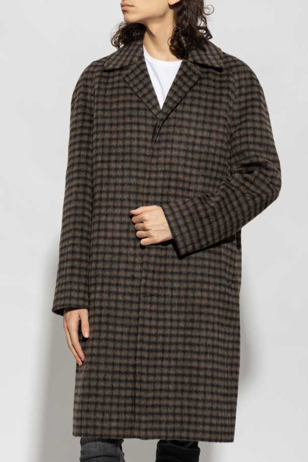 Brown and black ‘Drumm’ coat from AllSaints. Embellished with a check pattern, this style features notch lapels, button fastenings with a concealed placket,two frontal pockets, long sleeves and a single back vent.