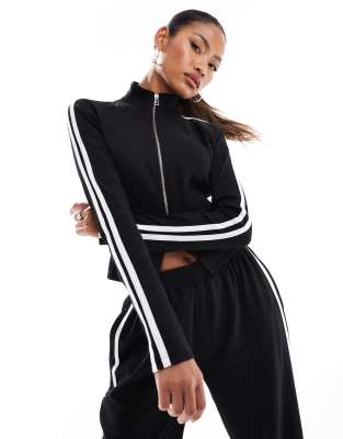 Kaiia ribbed zip up stripe sleeve jumper and wide leg joggers co-ord in black