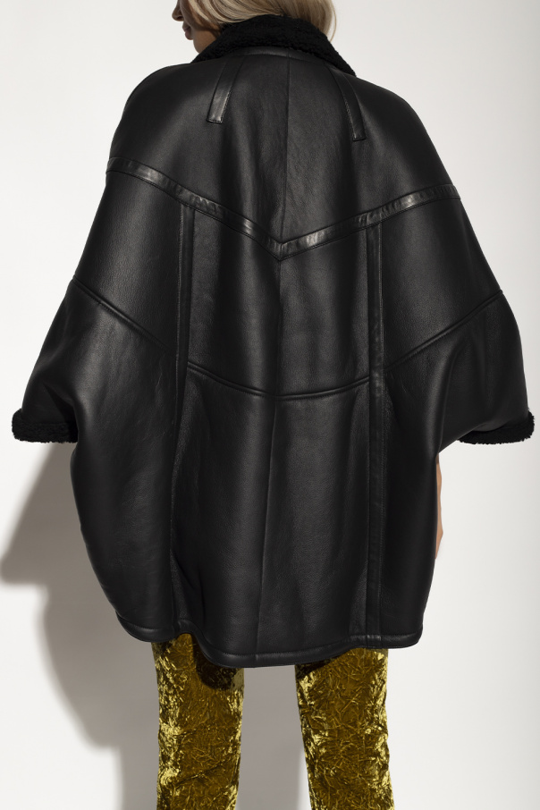 Black shearling jacket with a collar from Saint Laurent. Made of lamb shearling, this garment features a cape silhouette and is complete with button fastenings, two front pockets and black lamb fur lining.